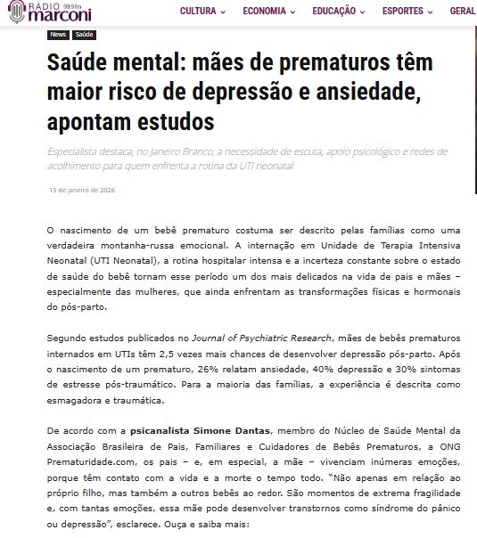 Psicanalista e membro do Núcleo de Saúde Mental da ONG Prematuridade.com, Simone Dantas, ganhou destaque na Rádio Marconi, de Santa Catarina, ao comentar estudos que apontam que mães de bebês prematuros apresentam maior risco de desenvolver ansiedade e depressão.