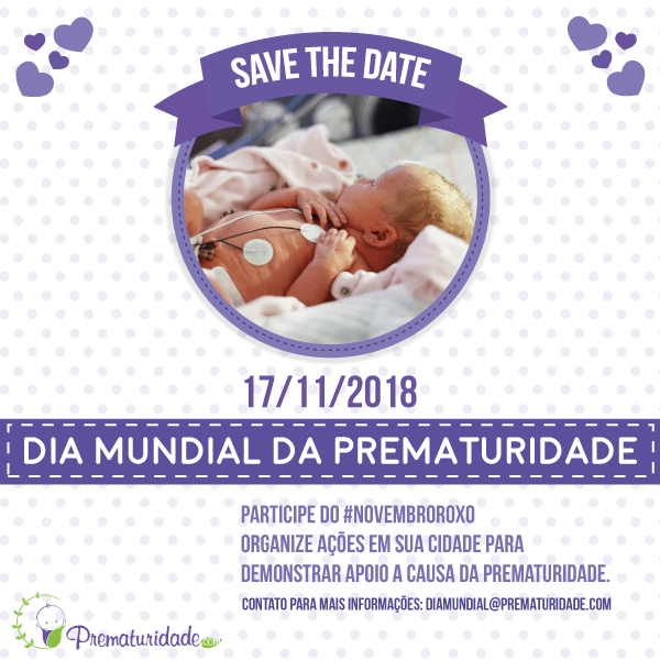 Está chegando: 17 de novembro é o Dia Mundial da Prematuridade! 1 em cada 10 bebês nasce prematuro e o Novembro Roxo promove um mês inteiro de ações, buscando chamar a atenção para a causa da prematuridade. Em 2018, devido ao feriado nacional do dia 15 de novembro, a ONG Prematuridade.com organiza suas atividades para 11 de novembro (domingo). A partipação da sociedade é fundamental nessa campanha que visa mudar a realidade: convide sua família, amigos, colegas, sua equipe de tabalho! Fale sobre a data, o tema e use a cor roxa. Confirme sua presença no nosso evento no Facebook e compartilhe fotos vestindo roxo com as hashtags da campanha (#DiaMundialdaPrematuridade #NovembroRoxo). Juntos somos muito mais fortes!