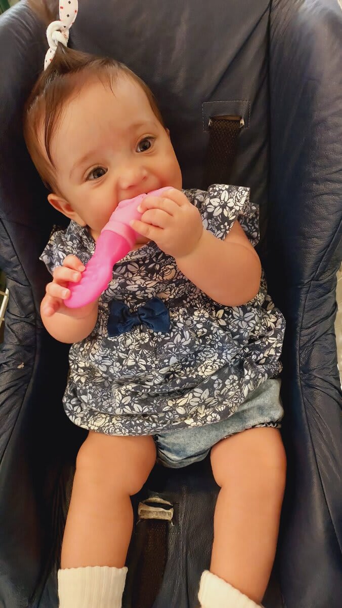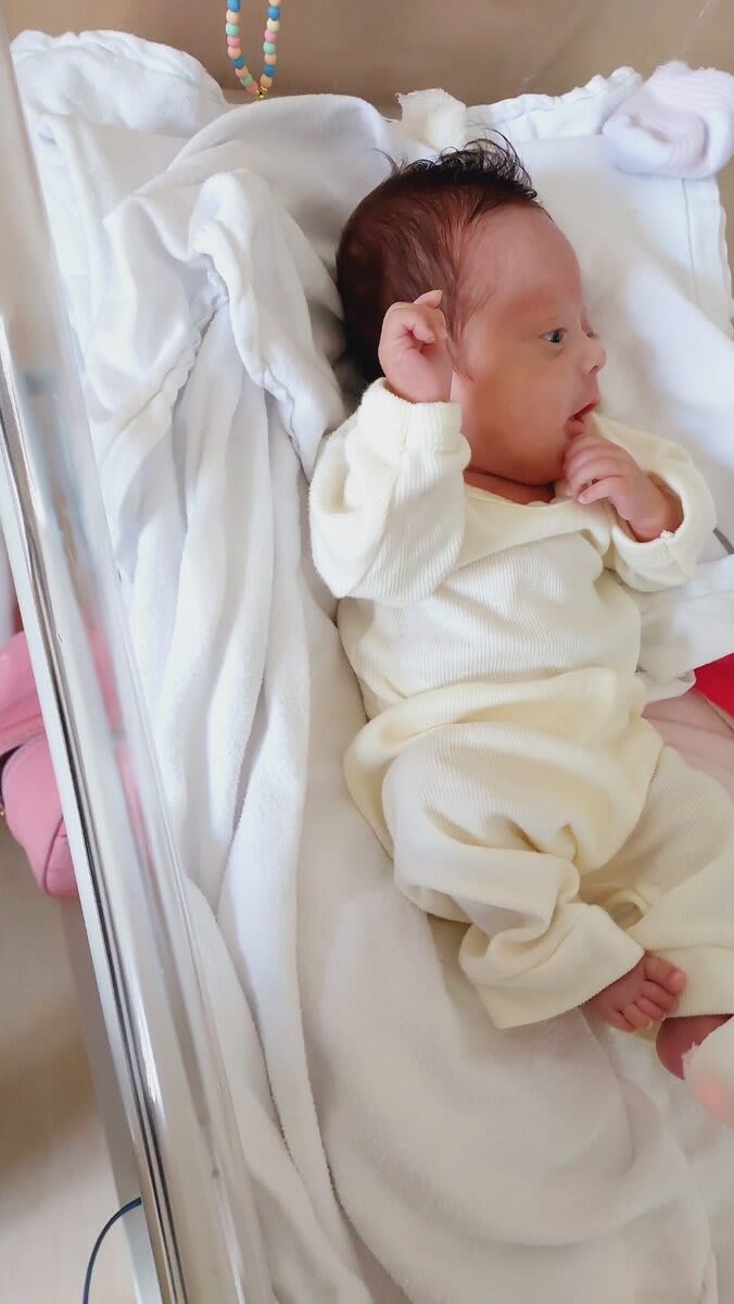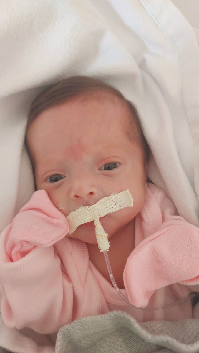 Tive pressão baixa depois do parto, meus amigos e familiares fizeram uma corrente de oração comigo para que ficasse tudo bem com a minha filha. Fico sem palavras pra explicar o tamanho do meu amor por ela. Veio de parto normal, precisou ser entubada no 2º dia de vida, tomando antibióticos. Ela nasceu no dia 20/10 mas no dia 22 apresentou sangramento, no dia 24 apresentou apnéia e com a necessidade de IoT novamente, oxigênio. Nova extração em 25/10, porém apresentou novamente uma apneia, com a necessidade de ser entubada novamente. Em 04/11 devido a queda de saturação e bradicardia foi novamente extubada em 13/11 mantida em VNI e passado para oxigênio inaladores em 18/11. Em 01/12 apresentou novas quedas de saturação, retornando para VNI e piorou no dia seguinte. Apresentou convulsões e foi extubada no dia 06/12. Quando foi passada para o O2 progredindo, foram coletados os exames e se manteve estável em ar ambiente desde do dia 15/01.