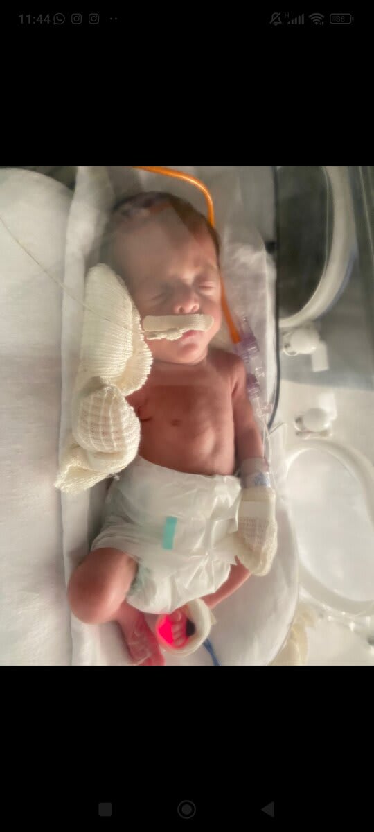 MATHEUS, pesando 1.185 g e 38 cm, foi o primeiro gemelar, parto cesárea por apresentação cefálica. Nasceu hipotônico, necessitou de reanimação, sendo mantido em CPAP por baby puff e transferido à UTI Neonatal. Devido à prematuridade extrema, foi realizado cateterismo umbilical. Evoluiu com icterícia intensa, iniciando fototerapia. No dia 14/09, apresentou piora do padrão respiratório, necessitando aumento de parâmetros em VNI. Evoluiu com apneia da prematuridade e necessidade de oxigenoterapia, além de aumento da dose de cafeína. Apresentou diversas apneias; foram coletados exames, identificada anemia e realizado concentrado de hemácias. Matheus saiu sem nenhuma sequela, mostrando que a fé é mais forte que qualquer diagnóstico.
