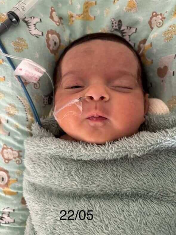 Ela foi direto para a UTI com desconforto respiratório e ficou com uso do CPAP. Acabou engolindo um pouco de líquido sanguinolento, ficou dois dias com a sonda aberta para sair todo aquele sangue que ela tinha engolido. Mas, com três dias de vida, começou a se alimentar e estava indo tudo bem, até que, com sete dias de vida, apresentou sangue nas fezes e um abdômen distendido. Ela foi entubada de forma eletiva, entrou em jejum e iniciou vários antibióticos.