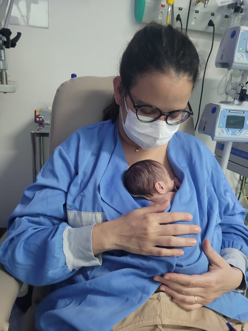 Olá, me chamo Emanuela e sou mãe da Isadora, minha prematurinha. Vou contar um pouco da nossa história pra vocês. Minha filha nasceu com 31 semanas de gestação devido a um quadro grave de Pré-eclâmpsia que desenvolvi, como chegamos a um estágio em que ela não estava mais recebendo os nutrientes necessários para continuar na barriga e havia risco pra mim e pra ela, foi feito um parto de emergência no dia 22/12/2022 e ela veio ao mundo com 1.145 kg. Passamos Natal, Ano Novo e Carnaval na UTI Neonatal, lá a Dorinha (como é carinhosamente chamada por nós) superou muitos obstáculos na luta pela vida. Precisou fazer transfusão para controlar uma anemia, teve sepse neonatal, displasia broncopulmonar, hemorragia cerebral grau I, várias apneias, muitas quedas de saturação sendo um episódio na minha frente, algo que me marcou muito e o dia em que tive mais medo na minha vida. Fez fototerapia para icterícia, fez uso de cpap e demorou um pouco até se habituar a respirar sem ele. Todos os dias, em todos os horários disponíveis eu ia ordenhar pra dar do meu leite pra ela, leite esse que ela tomou pela sonda por um bom tempo. Teve um quadro complicado de refluxo gastroesofágico em que todo leite que entrava, metade era colocado pra fora. Demorou pra ganhar peso, ganhava 20 gramas, perdia 15 e assim sucessivamente.