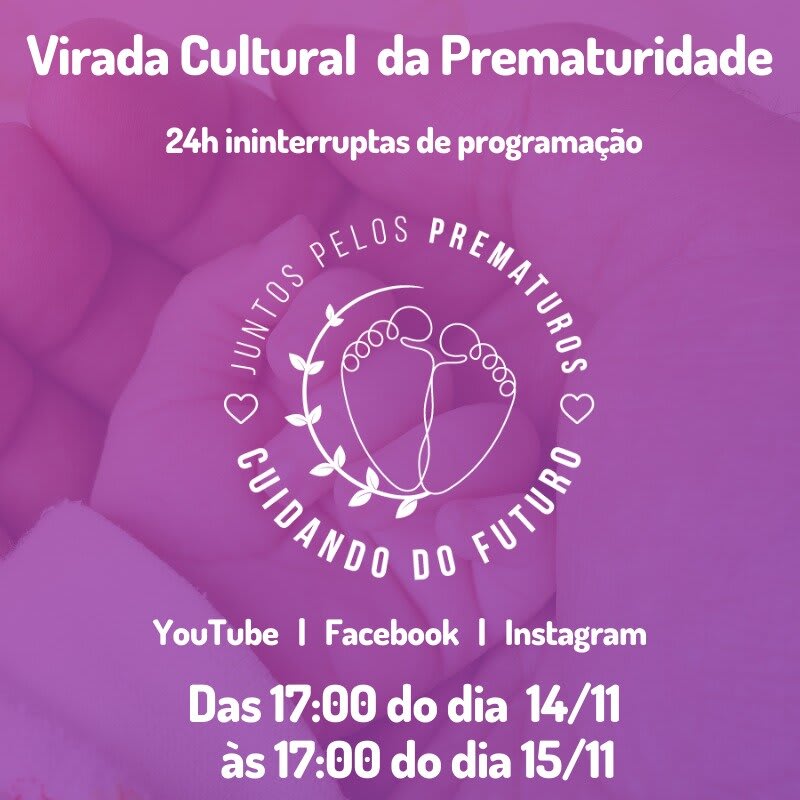 Novidade incrível que preparamos pra vocês com objetivo de deixarmos nosso Novembro Roxo ainda mais especial: Virada Cultural da Prematuridade, que vai das 17 horas do dia 14.11 até às 17 horas do dia 15.11, em nosso canal no Youtube e Facebook. ⠀